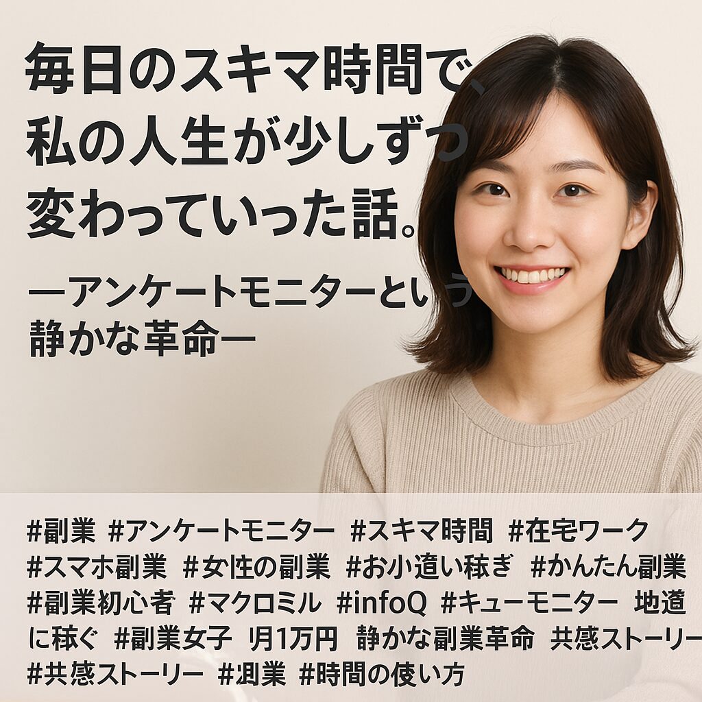 #副業 #アンケートモニター #スキマ時間 #在宅ワーク #スマホ副業 #女性の副業 #お小遣い稼ぎ #かんたん副業 #副業初心者 #マクロミル #infoQ #キューモニター #地道に稼ぐ #副業女子 #月1万円 #静かな副業革命 #共感ストーリー #副業日記 #20代副業 #時間の使い方